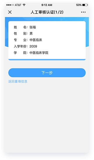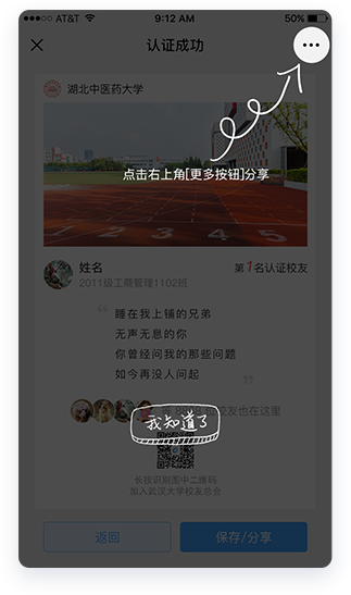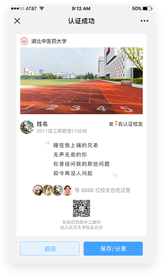 认证完成信息展示,并通过校友自分享挖掘更多校友信息。