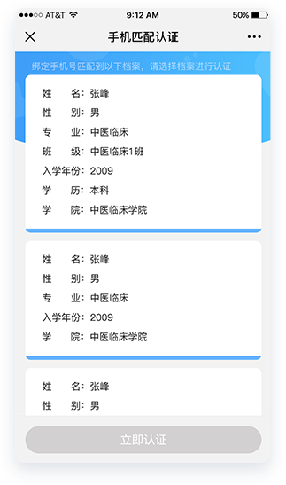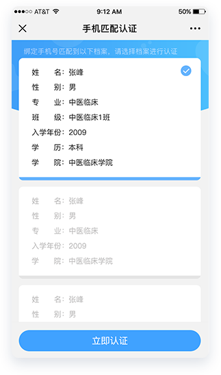 手机号匹配认证,通过校友档案库里已有信息,自动匹配校友身份,完成认证。