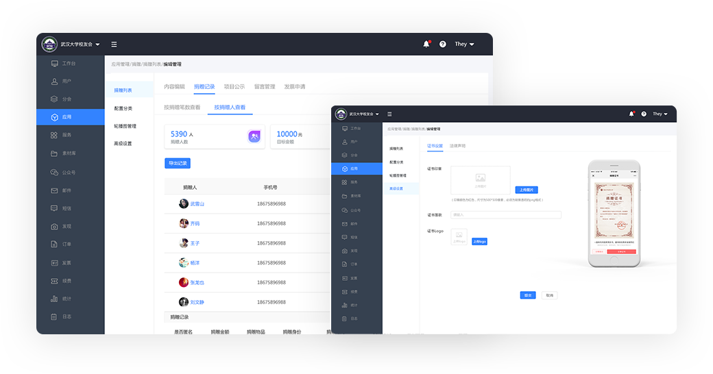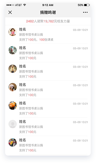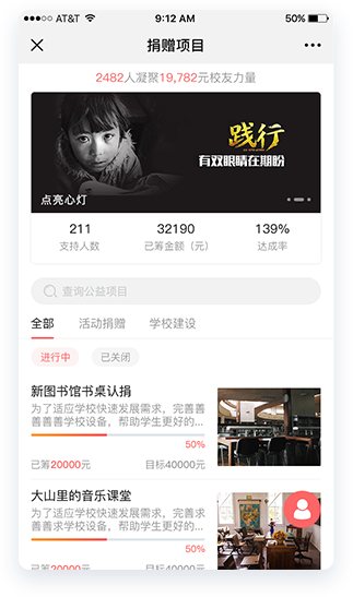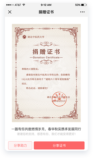 展示校友会或基金会发布的捐赠项目,可实时查看捐赠项目筹款进度,可查看捐赠动态,可通过线上支付参与捐款,捐赠成功后可查看自动生成的捐赠证书并分享证书。