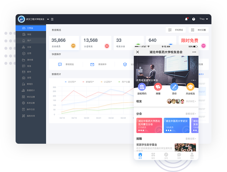 助力高校打造校友会外宣展示平台,为校友提供了解总会动态的多渠道信息窗口,涵盖校友会网站与校庆网站建设。