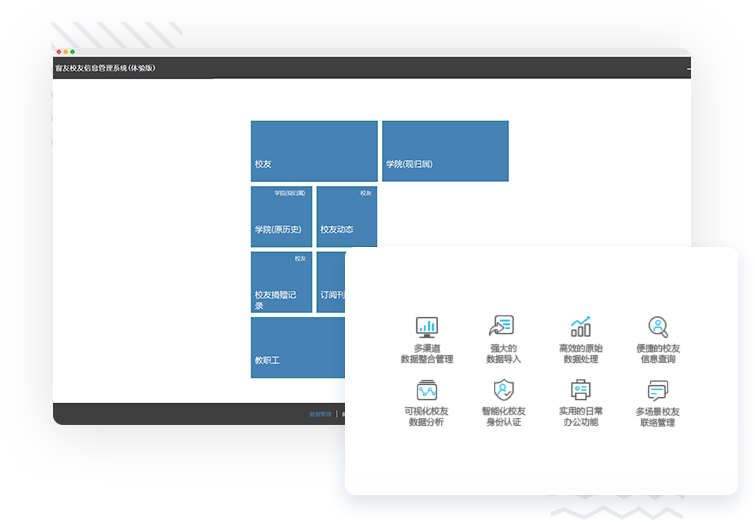智能库部署在学校服务器中,主要用于校友历史数据的整理入库及数据的日常通用办公管理,与应用云连接后更能做为校友智能身份认证的安全认证通道。